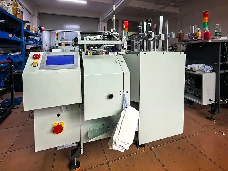 Designed with a side-position punching system, the automatic large-sized hang tag stringing machine is an innovative piece of equipment independently developed by our company for commonly used European- and American-style hang tags. It supports a maximum tag size of 160×210 mm (width × length).